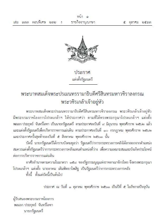 นายอาคม เติมพิทยาไพสิฐ เป็น รมว.คลัง เพื่อความเหมาะสมและเกิดประโยชน์ต่อการบริหารราชการแผ่นดิน ทั้งนี้ ตั้งแต่บัดนี้เป็นต้นไป
