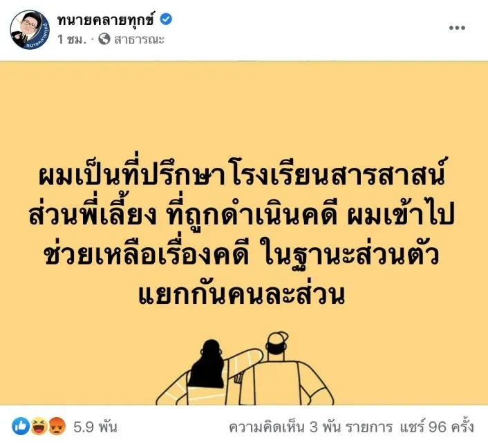หลังจากที่โดนโจมตีหนักในด้านลบ ล่าสุดทางด้านเพจดัง ทนายคลายทุกข์ ได้ออกมาโพสต์ข้อความว่า “ผมเป็นที่ปรึกษาโรงเรียนสารสาสน์ ส่วนพี่เลี้ยง ที่ถูกดำเนินคดี ผมเข้าไปช่วยเหลือเรื่องคดี ในฐานะส่วนตัว แยกกันคนละส่วน”
