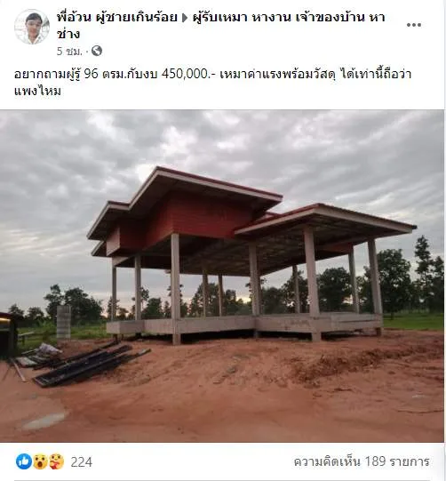 ผู้ใช้เฟซบุ๊ค พี่อ้วน ผู้ชายเกินร้อย ได้โพสภาพบ้านพร้อมตั้งคำถามลงในกลุ่ม ผู้รับเหมา หางาน เจ้าของบ้าน หาช่าง ว่า
