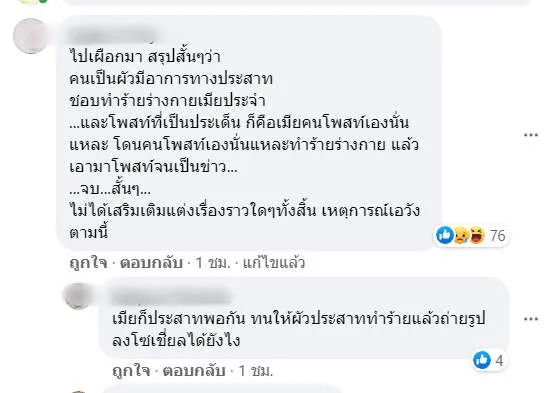 ด้านแฟนเพจ Drama-addict คอมเมนต์ สงสัยหนักเรื่องนี้ มีข้อความว่า "ไปเผือกมา สรุปสั้นๆว่า คนเป็นผัวมีอาการทางประสาท ชอบทำร้ายร่างกายเมียประจำ ...และโพสท์ที่เป็นประเด็น ก็คือเมียคนโพสท์เองนั่นแหละ โดนคนโพสท์เองนั่นแหละทำร้ายร่างกาย แล้วเอามาโพสท์จนเป็นข่าว.....จบ...สั้นๆ...ไม่ได้เสริมเติมแต่งเรื่องราวใดๆทั้งสิ้น เหตุการณ์เอวังตามนี้"