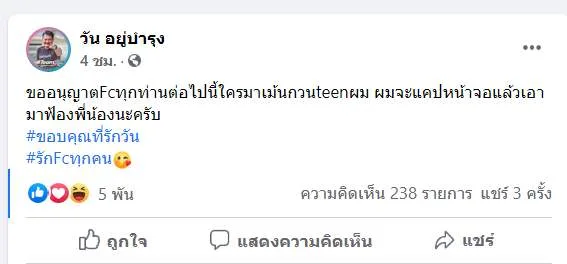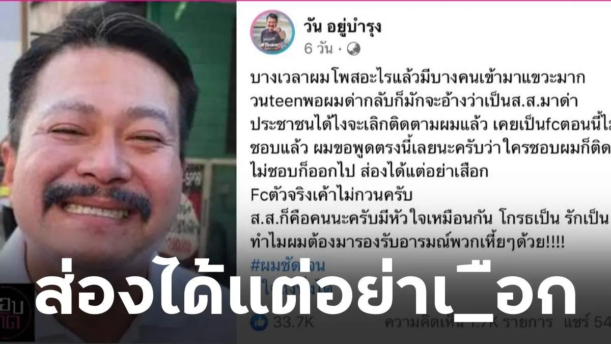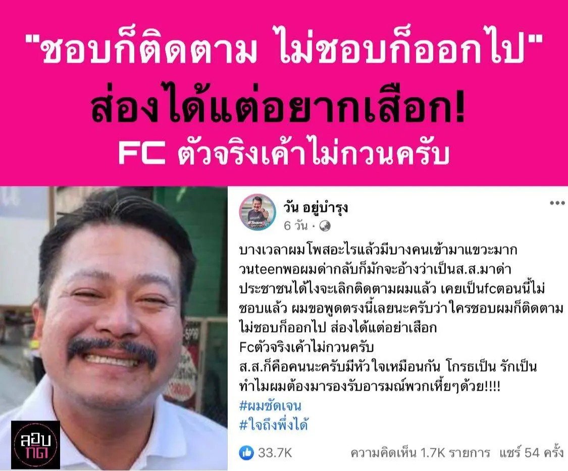 บางเวลาผมโพสอะไรแล้วมีบางคนเข้ามาแขวะมากวนteenพอผมด่ากลับก็มักจะอ้างว่าเป็นส.ส.มาด่าประชาชนได้ไงจะเลิกติดตามผมแล้ว เคยเป็นfcตอนนี้ไม่ชอบแล้ว ผมขอพูดตรงนี้เลยนะครับว่าใครชอบผมก็ติดตามไม่ชอบก็ออกไป ส่องได้แต่อย่าเสือก