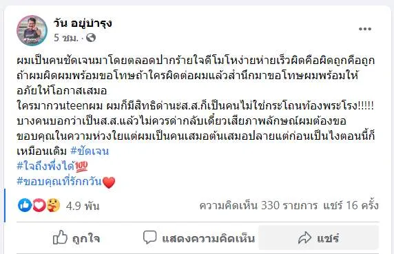 “วัน อยู่บำรุง” โพสต์เฟชบุ๊กถึงคนที่เข้ามาแขวะ