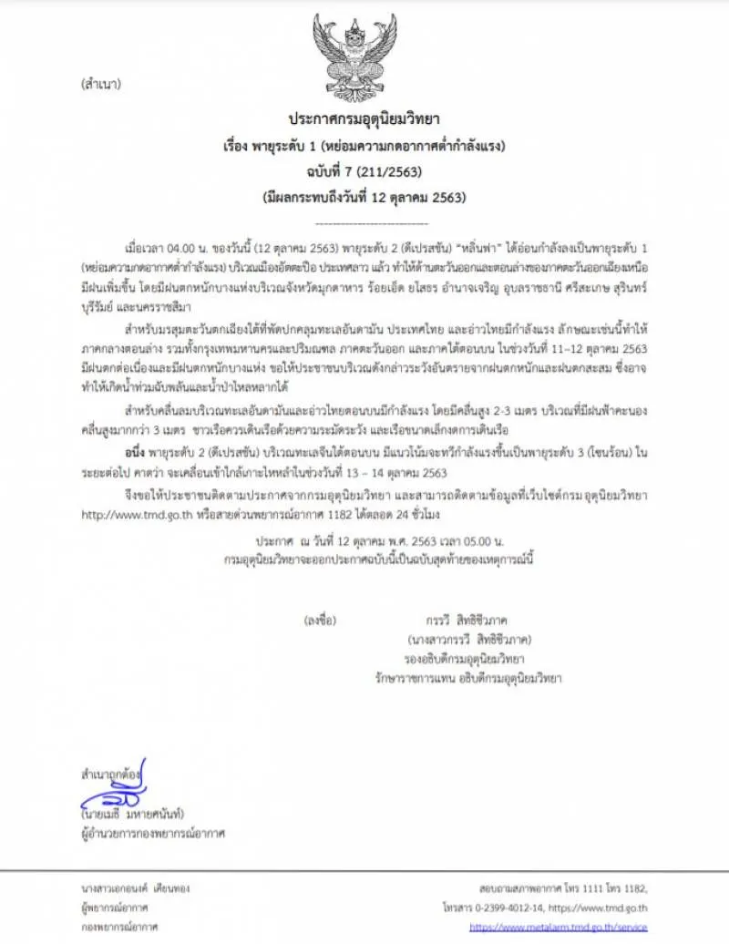 วันนี้ (12 ต.ค.63) กรมอุตุนิยมวิทยา ออกประกาศ "พายุระดับ 1 (หย่อมความกดอากาศต่ำกำลังแรง) (มีผลกระทบถึงวันที่ 12 ตุลาคม 2563)" ฉบับที่ 7 โดยระบุว่า เมื่อเวลา 04.00 น. ของวันนี้ (12 ตุลาคม 2563) พายุระดับ 2 (ดีเปรสชัน) หลิ่นฟา ได้อ่อนกำลังลงเป็นพายุระดับ 1 (หย่อมความกดอากาศต่ำกำลังแรง) บริเวณเมืองอัตตะปือ ประเทศลาว แล้ว