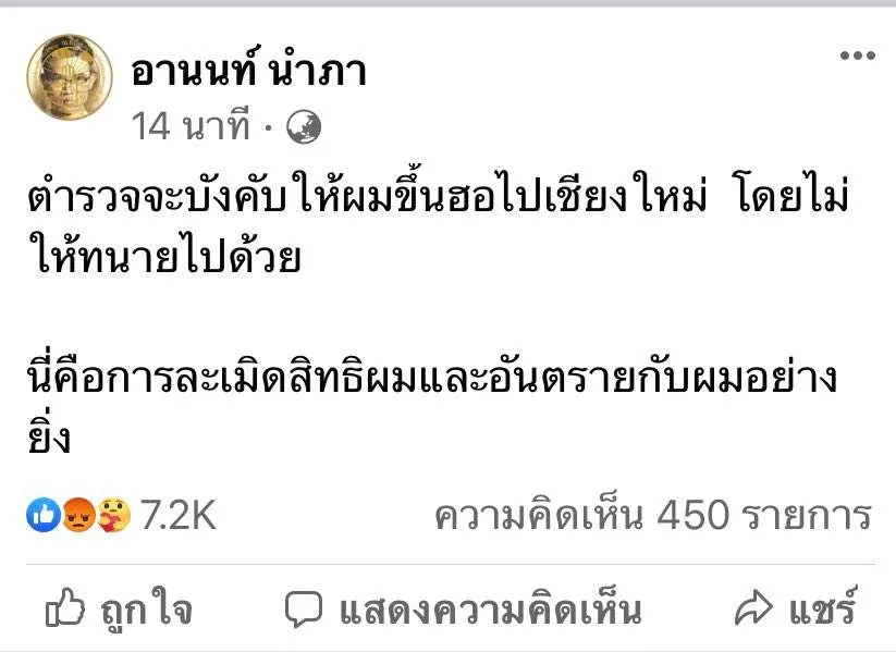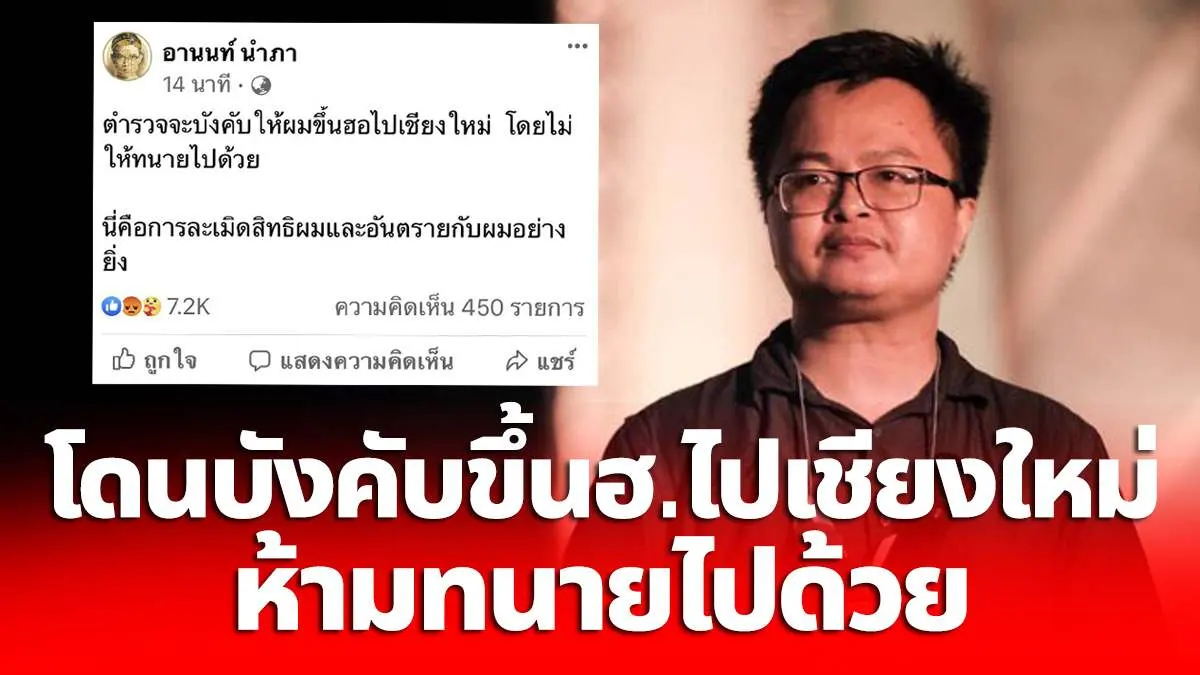 โดยทนายอานนท์ได้โพสต์เฟซบุ๊กระบุว่า ตำรวจจะบังให้ผมขึ้นฮอไปเชียงใหม่ โดยไม่ให้ทนายไปด้วย นี่คือการละเมิดสิทธิผมและอันตรายกับผมอย่างยิ่ง