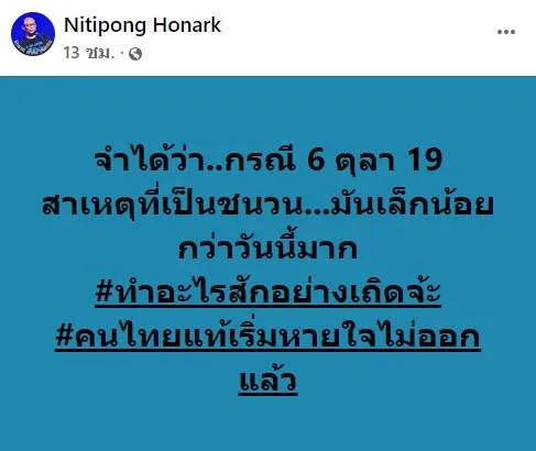 'ดี้ นิติพงษ์' ชี้ 6 ตุลา 19 ชนวนมันเล็กน้อยกว่านี้ บอกคนไทยแท้เริ่มหายใจไม่ออก