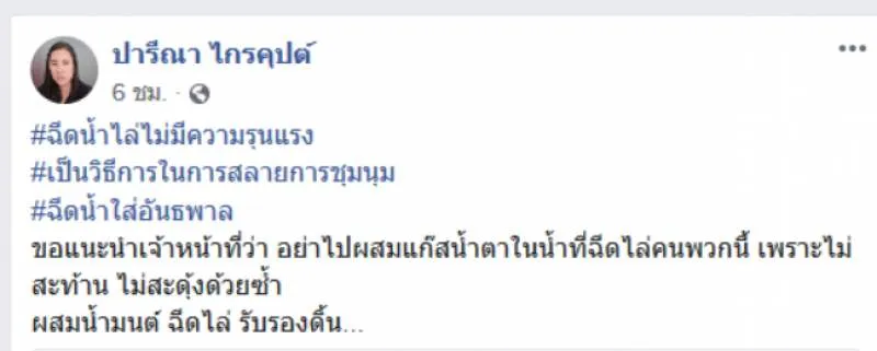เรียกได้ว่าเป็นประเด็นร้อนหลังจาก หลายคนออกมาประณามการใช้ความรุนแรงของรัฐบาลกับผู้ชุมนุม ล่าสุดเฟสบุ๊ค ปารีณา ไกรคุปต์ ได้โพสต์ข้อความระบุว่า ฉีดน้ำไล่ไม่มีความรุนแรง เป็นวิธีการในการสลายการชุมนุม ฉีดน้ำใส่อันธพาล ขอแนะนำเจ้าหน้าที่ว่า อย่าไปผสมแก๊สน้ำตาในน้ำที่ฉีดไล่คนพวกนี้ เพราะไม่สะท้าน ไม่สะดุ้งด้วยซ้ำ ผสมน้ำมนต์ ฉีดไล่ รับรองดิ้น