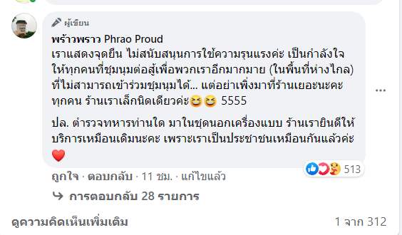 หลังจากสาวเจ้าของร้านกาแฟท่านหนึ่งโพสต์ประกาศ งดบริการตำรวจและทหาร ในเครื่องแบบ เพราะหันหลังให้ประชาชน อยากกินให้ถอดชุดไว้หน้าร้าน พร้อมให้กำลังใจผู้ชุมนุม