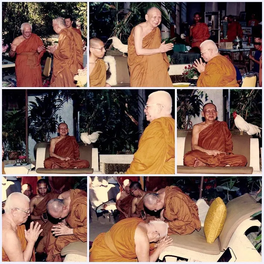 ในการเสด็จของสมเด็จพระสังฆราชไปเยือนสวนโมขลาราม 2 ครั้งนั้น ครั้งที่ 1 เมื่อเดือนกันยายน 2532 ท่านพุทธทาสทรุดลงกราบพระสังฆราช <1> และในการเสร็จอีกครั้งหนึ่งในเดือนมีนาคม 2534 <2> ท่านพุทธทาสก็กราบสมเด็จพระสังฆราชทั้ง 2 ครั้ง พระศากยวงศ์วิสุทธิ์ (อนิลมาน ธมฺมสากิโย) ท่านผู้ช่วยเจ้าอาวาสวัดบวรนิเวศ <3> ให้คำอธิบายว่า ในครานั้น ท่านพุทธทาสกล่าวว่า “ขอโอกาสกราบผู้บังคับบัญชา” สมเด็จพระสังฆราชทรงตรัสห้ามไว้ ตรัสว่าท่านพุทธทาสอาวุโสสูงกว่า แต่ท่านพุทธทาสก็กราบ สมเด็จพระสังฆราชจึงรีบกราบตอบกันไปมาพักใหญ่ <4> ภาพนี้เป็นภาพที่น่าประทับใจเป็นอย่างยิ่ง