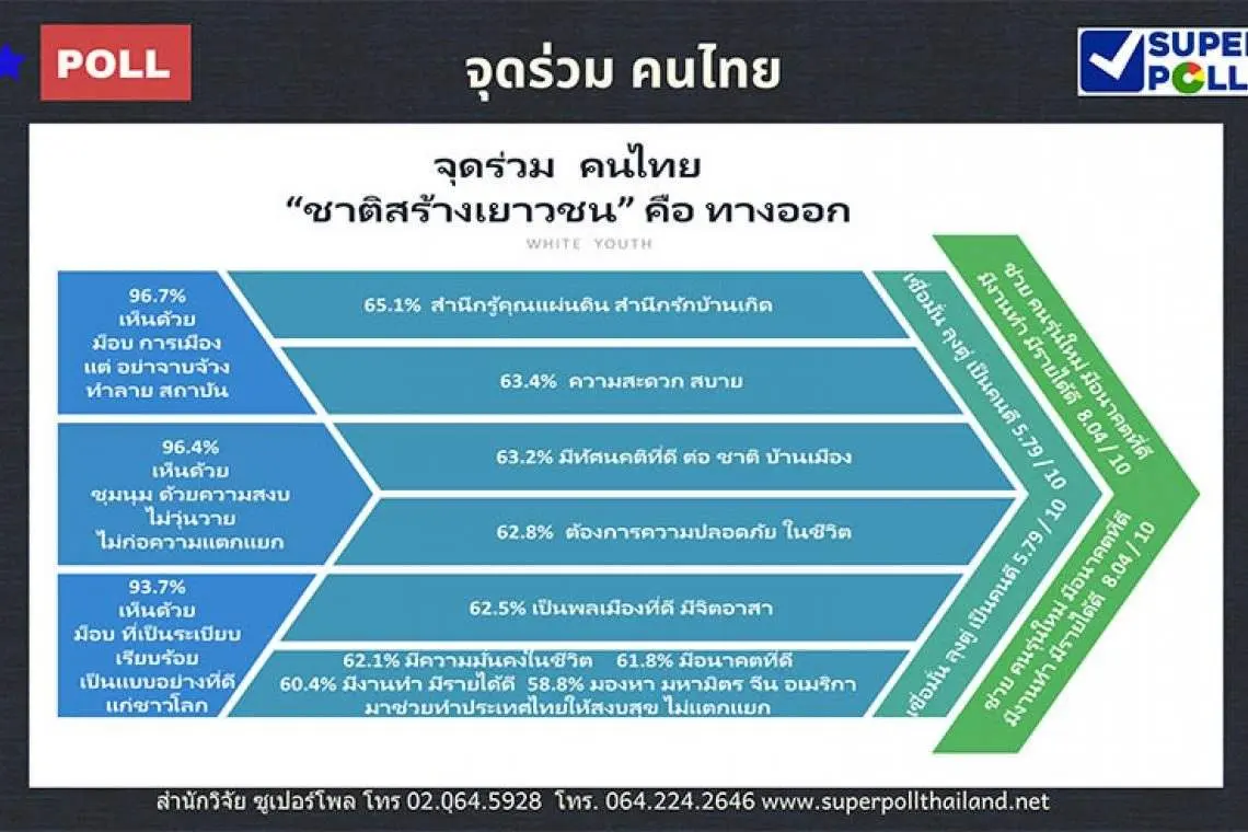 สำนักวิจัยซูเปอร์โพล (SUPER POLL) เปิดเผยผลสำรวจภาคสนาม เรื่องจุดร่วม คนไทย กรณีศึกษาประชาชนทุกสาขาอาชีพทั่วประเทศ 3,135 ตัวอย่าง ดำเนินโครงการระหว่าง 18-23 ต.ค. ที่ผ่านมา เมื่อถามความเห็นของประชาชนต่อม็อบเยาวชน พบว่า ส่วนใหญ่หรือร้อยละ 96.7 ระบุว่า ควรจะชุมนุมเรียกร้องเฉพาะเรื่องการเมือง อย่าจาบจ้วงล่วงละเมิดสถาบัน