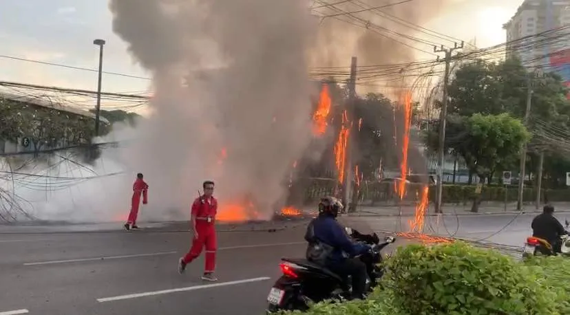 ระทึก! ขับรถไปแล้วสยอง "สายไฟฟ้าไหม้" หล่นขวางการจราจร