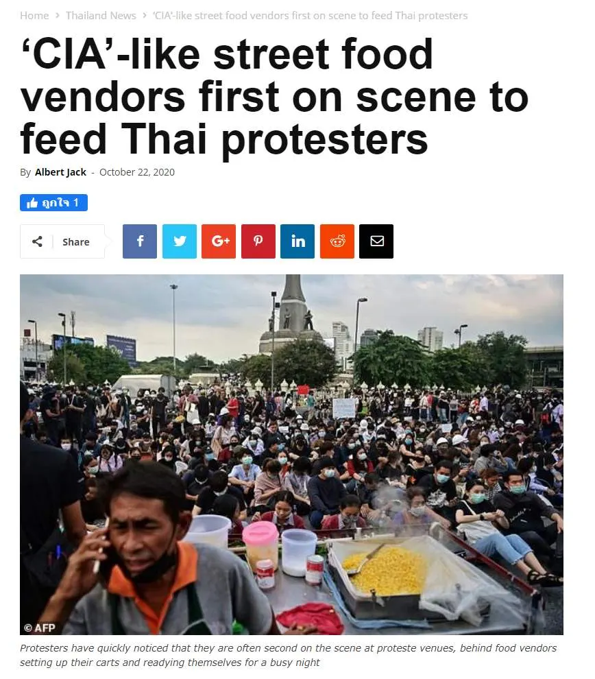 แต่ที่ต่างชาตินำเสนอข่าวไปทั่วโลกในความทึ่งของ “สตรีทฟู้ด” ที่ถูกเรียกว่า "หน่วย CIA" ผู้ที่มาไวกว่าม็อบเสมอ โดยเฉพาะในวันที่ 26 ตค. ที่ กลุ่มราษฎร เริ่มตั้งขบวนบริเวณแยกสามย่าน เพื่อเคลื่อนขบวนไปยังสถานทูตเยอรมนีนั้น