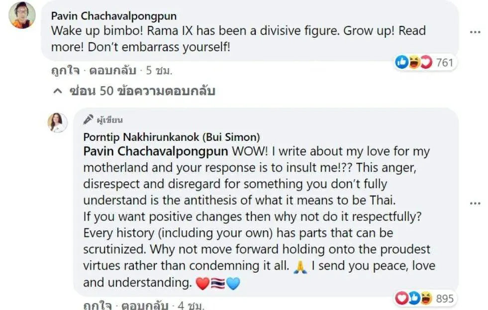 และหลังจากที่เธอได้โพสต์ข้อความนี้ออกไป ทางด้าน"นายปวิน ชัชวาลพงศ์พันธ์" นักวิชาการประจำสถาบันเอเชียตะวันออกเฉียงใต้ศึกษา มหาวิทยาลัยเกียวโต ได้เข้ามาคอมเมนต์ว่า “ตื่นขึ้นมา พวกสวยใสไร้สมอง (Bimbo) รัชกาลที่ ๙ สร้างความแตกแยก โตได้แล้ว หัดอ่านให้มากกว่านี้ อย่าอายตัวเอง”