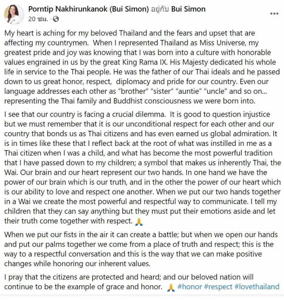 ดิฉันภาวนาให้ประชาชนได้รับความคุ้มครองและรับฟัง และประเทศชาติที่รักของเราจะยังคงเป็นแบบอย่างของความสง่างามและมีเกียรติ #เกียรติ #เคารพ #รักประเทศไทย"