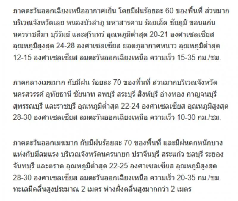 ภาคเหนืออากาศเย็น โดยมีฝน ร้อยละ 70 ของพื้นที่ ส่วนมากบริเวณจังหวัดน่าน แพร่ ลำพูน ลำปาง อุตรดิตถ์ พิษณุโลก สุโขทัย พิจิตร ตาก และเพชรบูรณ์ อุณหภูมิต่ำสุด 20-24 องศาเซลเซียส อุณหภูมิสูงสุด 28-30 องศาเซลเซียส ยอดดอยอากาศหนาว อุณหภูมิต่ำสุด 10-15 องศาเซลเซียส ลมตะวันออกเฉียงเหนือ ความเร็ว 10-30 กม.ต่อชม.