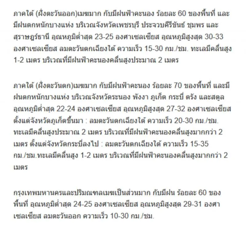 ส่วนคลื่นลมบริเวณทะเลอันดามันและอ่าวไทยจะมีกำลังปานกลาง โดยบริเวณทะเลอันดามันและอ่าวไทยตอนบนมีคลื่นสูงประมาณ 2 เมตร อ่าวไทยตอนล่างคลื่นสูง 1-2 เมตร บริเวณที่มีฝนฟ้าคะนองคลื่นสูงมากกว่า 2 เมตร ขอให้ชาวเรือเดินเรือด้วยความระมัดระวัง หลีกเลี่ยงการเดินเรือบริเวณที่มีฝนฟ้าคะนอง ในระยะนี้ ฝุ่นละอองขนาดเล็กเนื่องจากขณะนี้ประเทศไทยมีลมแรง และมีฝนเล็กน้อย ดังนั้นสภาพอากาศไม่เอื้อต่อการสะสมของฝุ่นละออง หมอกควัน พย ากรณ์อากาศสำหรับประเทศไทยตั้งแต่เวลา 06:00 วันนี้ ถึง 06:00 วันพรุ่งนี้