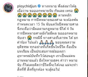 ล่าสุด ทางพลอย ชิดจันทร์ได้โพสต์ข้อความลงอินสาแกรมระบุว่า ทางทนาย พึ่งส่งมาให้ดูเมื่อวาน ขอออกหมายจับ กันเลย เหรอ 😭😭😭😭😭😭😭😭😭 ตามหลักกฎหมาย การปิดหมายของศาล จะต้องพ้นกำหนดเวลา 15 วัน นับแต่วันปิดหมายศาล จึงจะถือว่ามีผลตามกฎหมาย นี่ได้ 4 วัน การปิดหมายศาลยังไม่มีผล ขอออกหมายจับเรา 😭 กรณีนี้ ทางศาลที่เคารพ ได้ ยกคำร้อง ไปแล้ว 🙏🏻🙏🏻🙏🏻 ขอบคุณความยุติธรรม ทุกอย่างที่เกิดขึ้นในชีวิต ถือเป็นบทเรียน เป็นประสบการณ์ของเรา อุทาหรณ์บันทึกไว้สอนลูก เราเป็นแม่คน อ่านหมายแล้ว ยิ่งใจหายสุดๆ คำว่า หมายจับ ก็ไม่เคยคิดว่าชีวิตนี้จะได้เจอ แม่จะทำสิ่งที่ดี สิ่งที่ถูกต้อง จะสู้ต่อไป