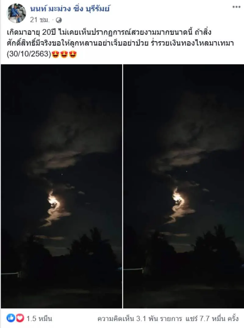 วันที่ 31 ตุลาคม 2563 ผู้สื่อข่าว siamtoday ได้รับรายงานว่า โลกออนไลน์มีการส่งต่อภาพเรื่องราวของผู้ใช้เฟซบุ๊กรายหนึงชื่อ นนท์ มะม่วง ซิ่ง บุรีรัมย์ ซึ่งได้โพสต์ภาพท้องฟ้ายามค่ำคืน พร้อมระบุข้อความว่า เกิดมาอายุ 20ปี ไม่เคยเห็นปรากฏการณ์สวยงามมากขนาดนี้ ถ้าสิ่งศักดิ์สิทธิ์มีจริงขอให้ลูกหลานอย่าเจ็บอย่าไข้ ร่ำรวยเงินทองไหลมาเทมา 30102563