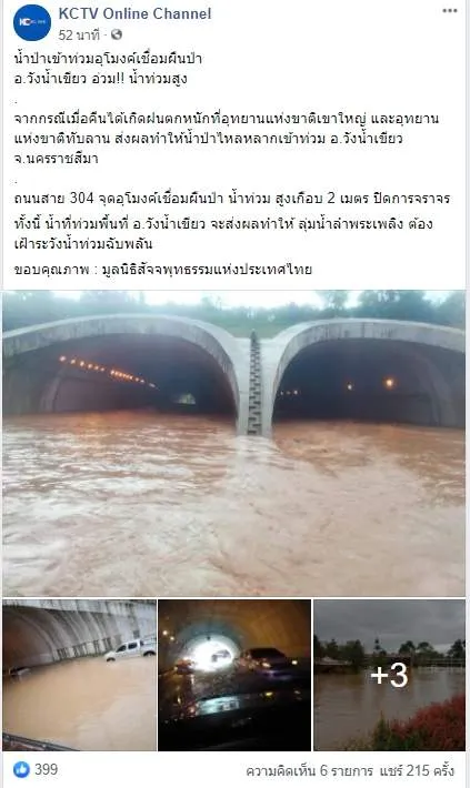 ถนนสาย 304 จุดอุโมงค์เชื่อมผืนป่า น้ำท่วม สูงเกือบ 2 เมตร ปิดการจราจร