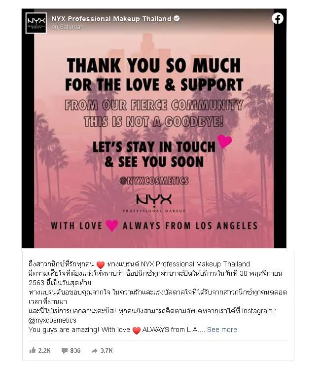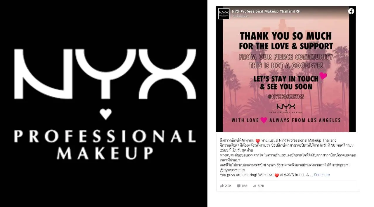 แฟนเพจ NYX Professional Makeup Thailand ของแบรนด์เครื่องสำอางชื่อดังระดับโลก โพสต์ข้อความว่า ถึงสาวกนิกซ์ที่รักทุกคน ทางแบรนด์ NYX Professional Makeup Thailand มีความเสียใจที่ต้องแจ้งให้ทราบว่า ช็อปนิกซ์ทุกสาขาจะปิดให้บริการในวันที่ 30 พฤศจิกายน 2563 นี้เป็นวันสุดท้าย ทางแบรนด์ขอขอบคุณจากใจ ในความรักและแรงบันดาลใจที่ได้รับจากสาวกนิกซ์ทุกคนตลอดเวลาที่ผ่านมา และนี่ไม่ใช่การบอกลานะคะซิส ทุกคนยังสามารถติดตามอัพเดทจากเราได้ที่ Instagram : @nyxcosmetics You guys are amazing! With love ALWAYS from L.A.