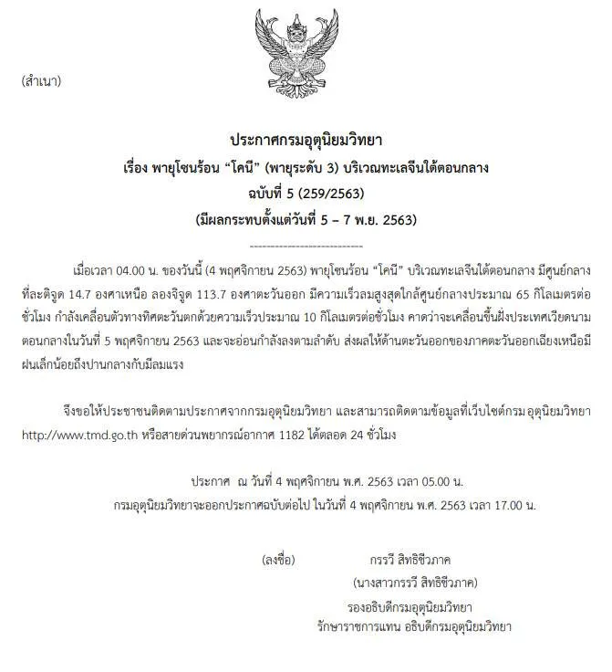 เมื่อวันที่ 4 พฤศจิกายน 2563 นางสาวกรรวี สิทธิชีวภาค รองอธิบดีกรมอุตุนิยมวิทยา รักษาราชการแทน อธิบดีกรมอุตุนิยมวิทยา ได้ออกประกาศกรมอุตุนิยมวิทยา เรื่อง "พายุโซนร้อน โคนี (พายุระดับ 3) บริเวณทะเลจีนใต้ตอนกลาง (มีผลกระทบตั้งแต่วันที่ 5 ถึง 7 พ.ย. 2563)" ฉบับที่ 5 ลงวันที่ 04 พฤศจิกายน 2563