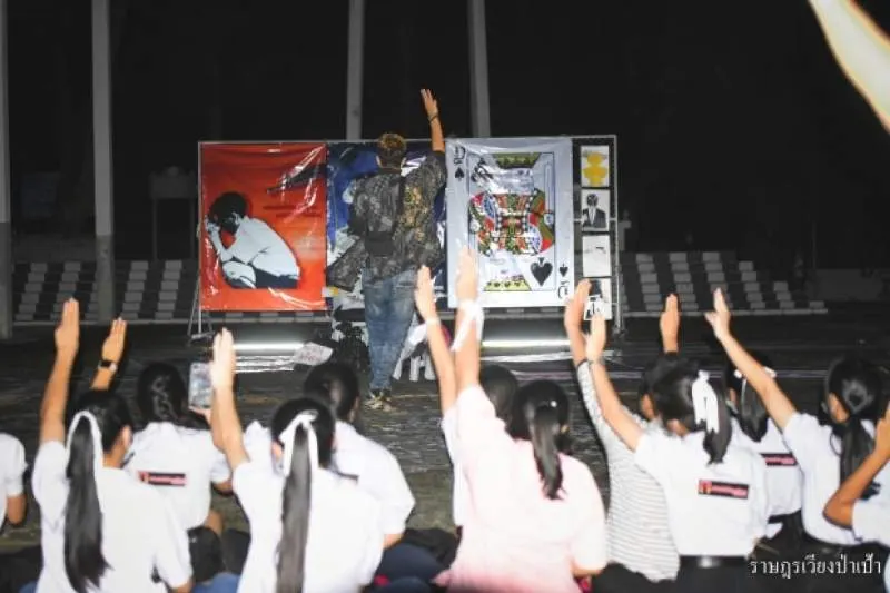 ที่จ.เชียงราย วันนี้มีกิจกรรม #เวียงป่าเป้าบ่เอาเผด็จการ เดิมจะจัดในตลาดสด แต่ถูกจนท.นำบันทึกปจว. ที่ระบุว่าเจ้าของตลาดไม่ให้จัดไปแสดง จนนร.ต้องย้ายไปจัดในป่าช้าแทน
