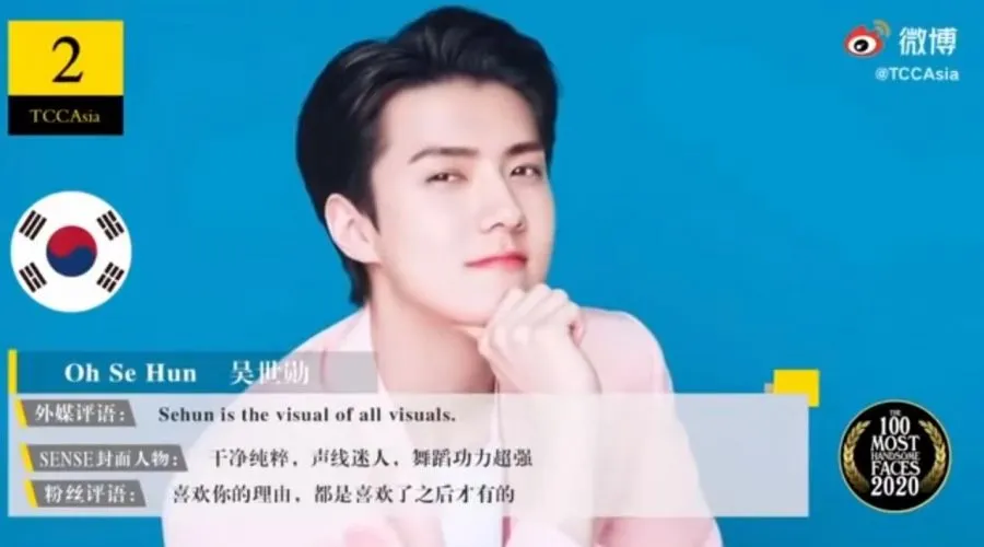 สำหรับ รางวัล 100 อันดับ คนดังที่มีใบหน้าหล่อที่สุดในเอเชีย 2020 (100 most Handsome faces in Asia-Pacific 2020) อันดับ 1 คือ เซียวจ้าน นักร้องและนักแสดงชื่อดังชาวจีน