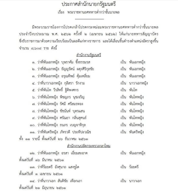 มีพระบรมราชโองการโปรดเกล้าโปรดกระหม่อมพระราชทานยศทหารต่ำกว่าชั้นนายพล ประจำปีงบประมาณ พ.ศ. 2562 ครั้งที่ 2 (เมษายน 2562) ให้แก่นายทหารสัญญาบัตร ซึ่งรับราชการมาด้วยความเรียบร้อย เป็นผลดีแก่ทางราชการ และได้เลื่อนขึ้นดำรงตำแหน่งอัตราสูงขึ้น จำนวน 8,608 ราย