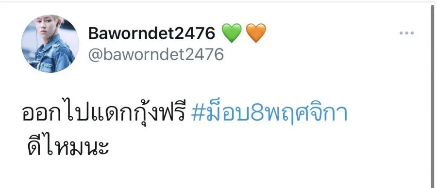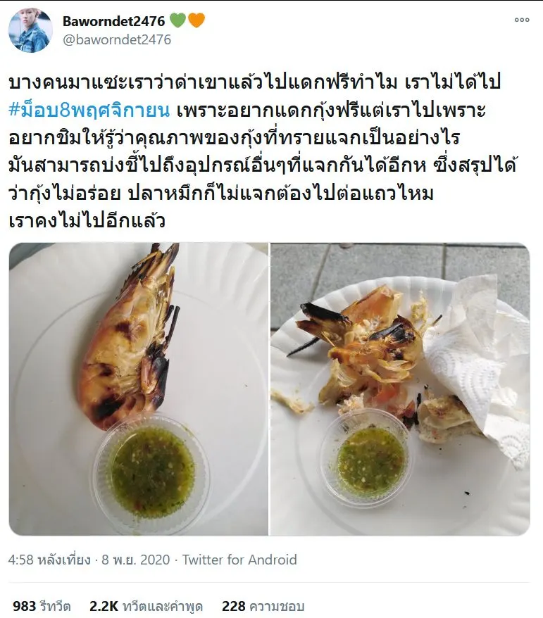"บางคนมาแซะเราว่าด่าเขาแล้วไปแดกฟรีทำไม เราไม่ได้ไป #ม็อบ8พฤศจิกายน เพราะอยากแดกกุ้งฟรีแต่เราไปเพราะอยากชิมให้รู้ว่าคุณภาพของกุ้งที่ทรายแจกเป็นอย่างไร มันสามารถบ่งชี้ไปถึงอุปกรณ์อื่นๆที่แจกกันได้อีกห ซึ่งสรุปได้ว่ากุ้งไม่อร่อย ปลาหมึกก็ไม่แจกต้องไปต่อแถวไหม เราคงไม่ไปอีกแล้ว"