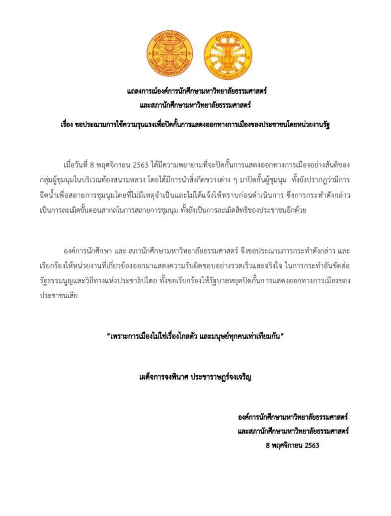แถลงการณ์องค์การนักศึกษาและสภานักศึกษา มหาวิทยาลัยธรรมศาสตร์