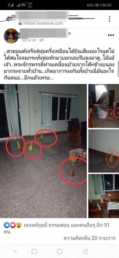 เรียกได้ว่าเป็นอีกหนึ่งประเด็นสุดแปลกที่เกิดขึ้นกับผู้ใช้เฟซบุ๊กรายหนึ่ง ขณะสวดมนต์อยู่บนบ้าน จากนั้นได้ยินเสียงแปลกๆดังมาจากชั้นล่าง จึงได้ตัดสินใจลงมาดู กลับพบว่าพระจักรพรรดิ์เคลื่อนย้ายจากโต๊ะบูชาลงมากระจายทั่วบ้าน สร้างความแปลกใจให้กับสมาชิกในครอบครัวเป็นอย่างมาก