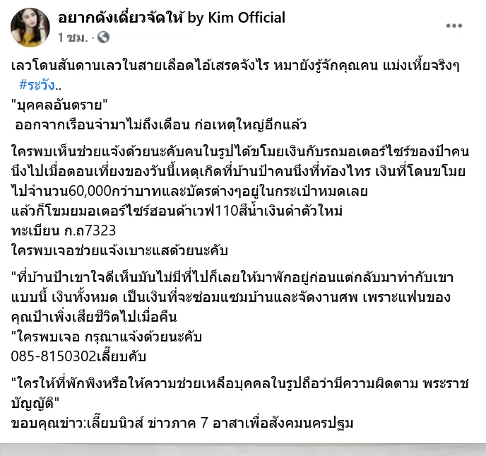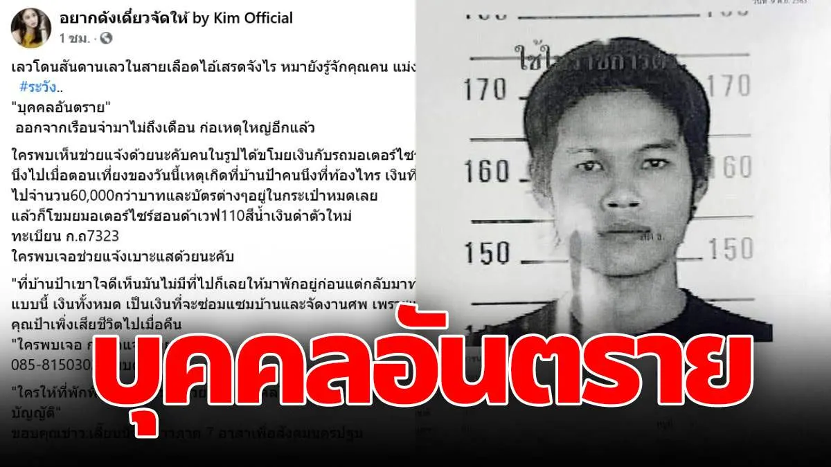 เฟสบุคเพจ อยากดังเดี๋ยวจัดให้ by Kim Official ได้ออกมาแจ้งเตือน ถึงบุคคลอันตราย โดยมีรายละเอียดดังนี้