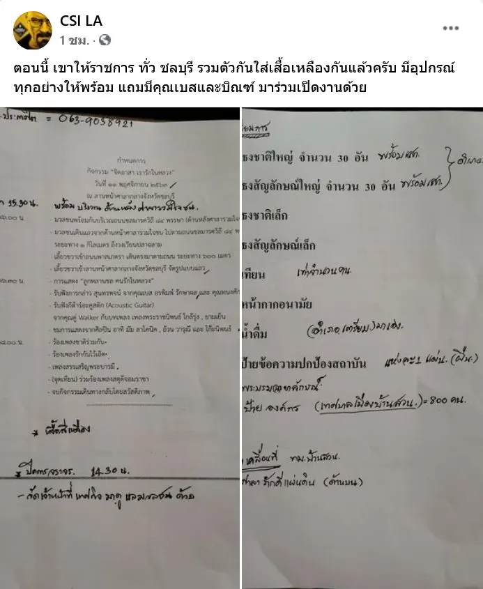 เพจดัง CSI LA ได้ออกมาโพสภาพ ที่มีข้อมูลรายละเอียด ให้ราชการทั่วชลบุรี รวมตัวกันใส่เสื้อเหลือง รายละเอียดดังนี้