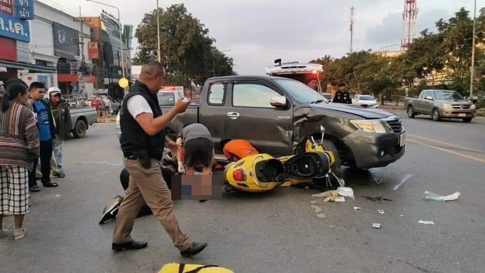 สุดสะเทือนใจ! รถกระบะเลี้ยวกลับรถ ตัดหน้ารถมอไซค์สองแม่ลูก ลูกเสียชีวิตทันที แม่ขาหักสองท่อน