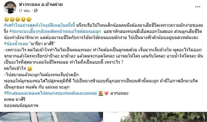 #เศร้าใจอย่างสุดหัวใจอุบัติเหตุในครั้งนี้ มรึงจะรีบไปไหนเด็กน้อยคนนึงต้องมาเสียชีวิตเพราะความมักง่ายของมรึง #รถกระบะเลี้ยวกลับรถตัดหน้ารถมอไซค์สองแม่ลูก แม่ขาหักสองท่อนมีเลือดออกในสมอง ส่วนลูกเสียชีวิต น้องกำลังน่ารักมาก แต่ต้องมาจบชีวิตกับการใช้รถใช้ถนนแบบมักง่าย ไปเป็นนางฟ้าตัวน้อบอยู่บนสวรรค์นะคะ #น้องน้ำหอม "มารียา มาศิริ"