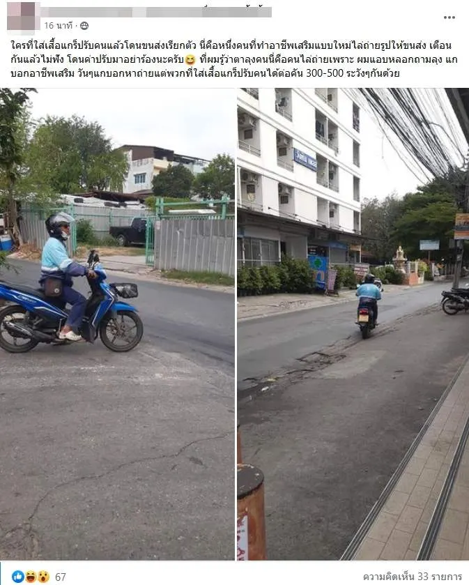 ที่ผมรู้ว่าตาลุงคนนี่คือคนไล่ถ่ายเพราะ ผมแอบหลอกถามลุง แกบอกอาชีพเสริม วันๆแกบอกหาถ่ายแต่พวกที่ใส่เสื้อแกร็ปรับคนได้ต่อคัน 300-500 ระวังๆกันด้วย