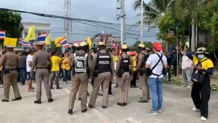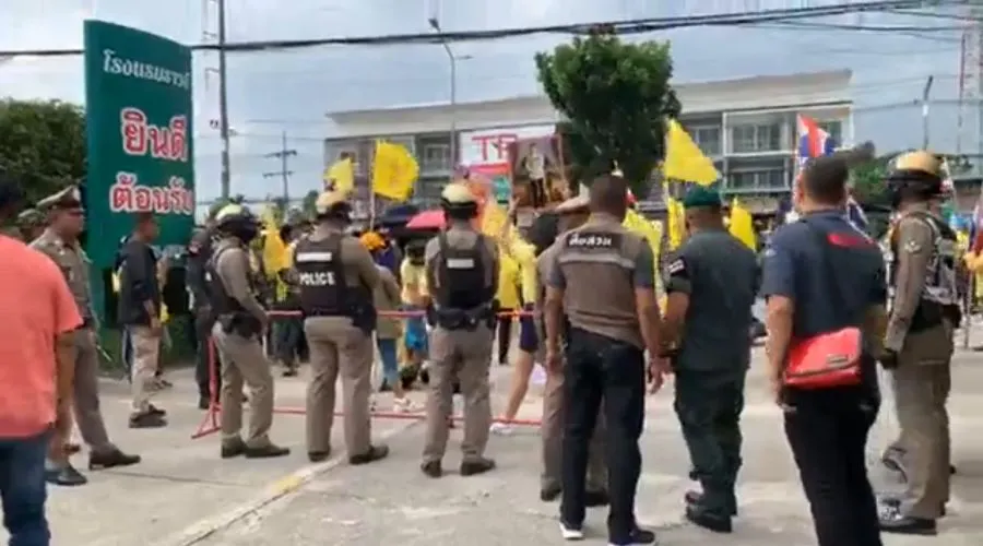 บรรยากาศหน้า รร.ราวดี กลุ่มคนปกป้องสถาบันในภาคใต้กว่า100คนใส่เสื้อเหลืองรวมตัวปิดล้อมนายธนาธร จึงรุ่งเรืองกิจที่ เดินทางมาช่วยผู้สมัครนายกอบจ.นครฯ หาเสียง