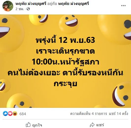 "อุ๊ หฤทัย" โพสต์ปลุกระดม โพสต์ระบุว่า พรุ่งนี้ 12 พ.ย.63 เราจะเดินรุกฆาต 10:00น.หน้ารัฐสภา คนไม่ต้องเยอะ ตานี้รับรองหนีกันกระจุย