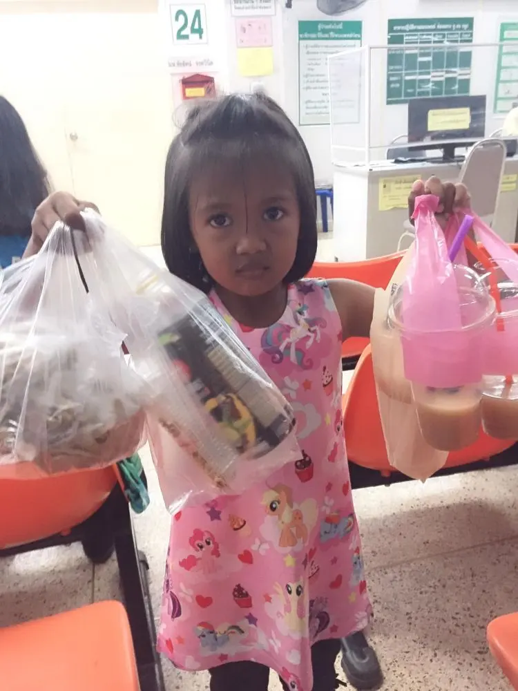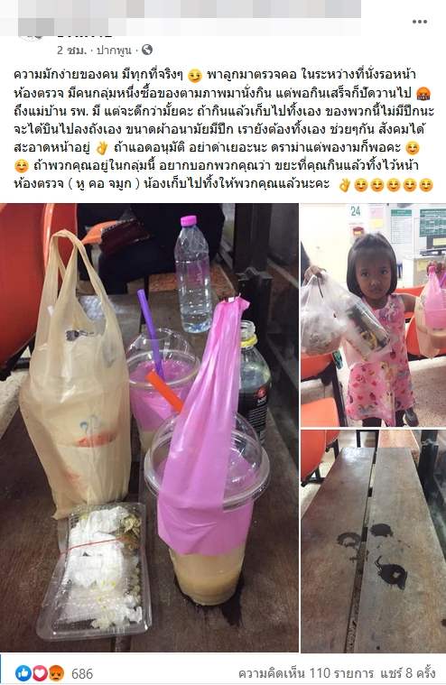 พาลูกมาตรวจคอ ในระหว่างที่นั่งรอหน้าห้องตรวจ มีคนกลุ่มหนึ่งซื้อของตามภาพมานั่งกิน แต่พอกินเสร็จก็ปัดวานไป