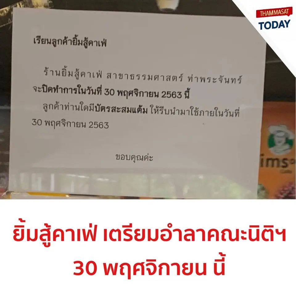 เฟซบุ๊ก Thammasat Today ได้โพสว่า ร้านกาแฟ ยิ้มสู้คาเฟ่ ติดประกาศว่า ร้านยิ้มสู้คาเฟ่ สาขาธรรมศาสตร์ ท่าพระจันทร์ จะปิดทำการในวันที่ 30 พ.ย.63 นี้ ลูกค้าท่านใดมีบัตรสะสมแต้ม ให้รีบนำมาใช้ภายในวันที่ 30 พ.ย.