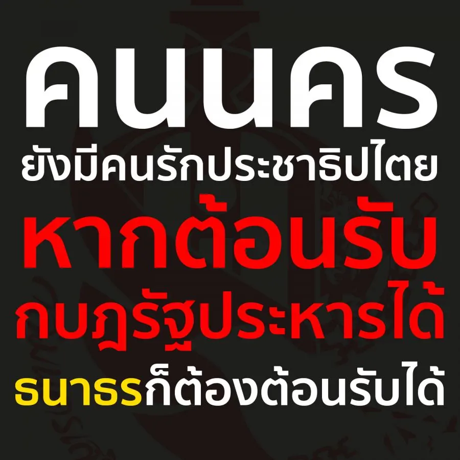 ทุกคนอยากเห็นประเทศดีขึ่น เยาวชนอยากเห็นการเปลี่ยนแปลงไม่ใช่คำว่าราคายาง 7 บาทกูก็ยอม ใครที่เห็นต่างไปจากสิ่งที่คุณคิดคุณจะทำร้ายร่างกาย คุณจะฆ่าจะแกง หากคุณคิดเช่นนั้น คุณย้อนมองกลับไปว่าความาเป็นคนยังเหลือหรือเปล่า ธนาธรยังไม่ได้บริหารประเทศ ยังไม่ได้ทำผิด แต่คนที่ล้มล้างการปกครอง และเป็นกบฏ ล้มล้างการปกครองฉีกรัฐธรรมนูญ ทุกวันนี้ประยุทธ์โกงเสียยิ่งกว่านายกทุกสมัยที่มีมา ประเทศเป็นหนี้เต็มเพดาน #ตาสว่างเถอะชาวนคร ประยุทธ์ไม่ได้ดีจริงตามที่เขาหลอกลวง ประเทศนี้เป็นของทุกคน หากคุณต้อนรับกบฎได้ เราก็จะไปต้อนรับคนที่ยืนเคียงข้างประชาธิปไตยเช่นกัน