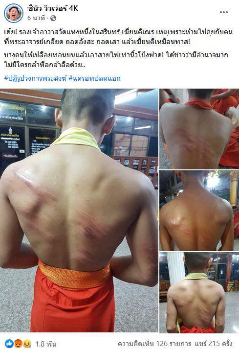 เฮ้ย! รองเจ้าอาวาสวัดแห่งหนึ่งในสุรินทร์ เฆี่ยนตีเณร เหตุเพราะห้ามไปคุยกับคนที่พระอาจารย์เกลียด ถอดอังสะ กอดเสา แล้วเฆี่ยนตีเหมือนทาส!