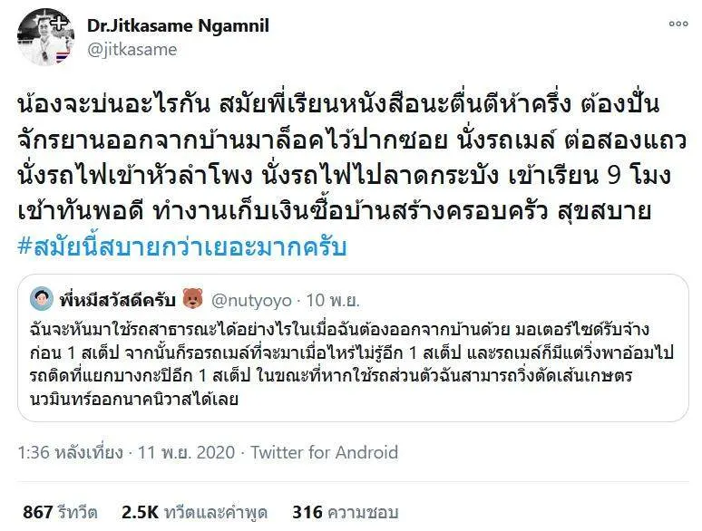 น้องจะบ่นอะไรกัน สมัยพี่เรียนหนังสือนะตื่นตีห้าครึ่ง ต้องปั่นจักรยานออกจากบ้านมาล็อคไว้ปากซอย นั่งรถเมล์ ต่อสองแถว นั่งรถไฟเข้าหัวลำโพง นั่งรถไฟไปลาดกระบัง เข้าเรียน 9 โมงเช้าทันพอดี ทำงานเก็บเงินซื้อบ้านสร้างครอบครัว สุขสบาย#สมัยนี้สบายกว่าเยอะมากครับ https://t.co/HqjhLR4PVa