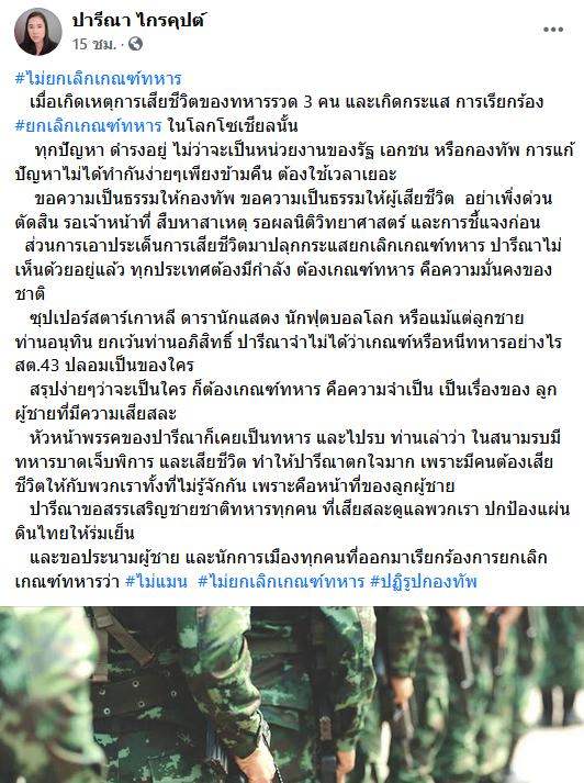 "ปารีณา ไกรคุปต์" โพสต์ประณาม! คนที่ต่อต้านเกณฑ์ทหาร ขอความเป็นธรรมให้กองทัพ