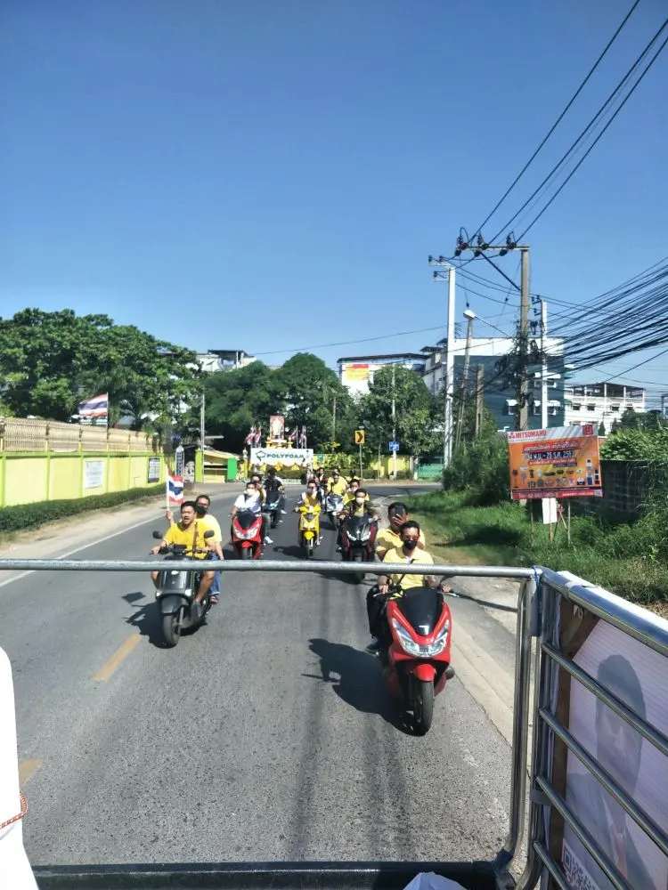 เสื้อเหลืองรวมพลังขับรถบีบแตรขับไล่ระหว่างที่ก้าวไกลประชาสัมพันธ์สมัครสมาชิกพรรค