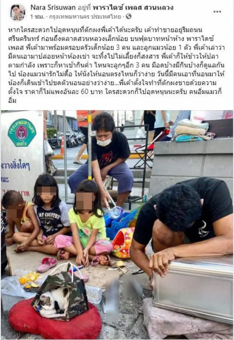 ชีวิตคนเราเลือกเกิดไม่ได้ แต่เลือกที่จะเป็นได้ เรื่องราวชีวิตของครอบครัวหนึ่ง ที่พ่อทำงานหาเงิน เพื่อดูแลบุตร 3 คนเพียงลำพัง พร้อมกับแมวน้อยอีก 1 ตัว โดยได้นั่งทำที่โกยขยะขายอยู่ริมถนน หวังให้คนที่ผ่านไปมาช่วยอุดหนุนเพื่อจะได้มีเงินมาซื้อข้าวให้บุตรทั้ง 3 ได้กินให้อิ่มซึ่งเรื่องราวนี้คุณ Nara Srisuwan ผู้เป็นนำเรื่องราวมาเผยแพร่ยังบอกด้วยว่าที่โกยขยะของพวกเขาราคาไม่แพงแถมคุณภาพดีด้วย หากใครสะดวกไปอุดหนุนที่ตักผงพี่เค้าได้นะครับ เค้าทำขายอยู่ริมถนนศรีนครินทร์ ก่อนถึงตลาดสวนหลวงเล็กน้อย บนฟุตบาทหน้าห้าง พาราไดซ์ เพลส พี่เค้ามาพร้อมครอบครัวหนูน้อย 3 คน
