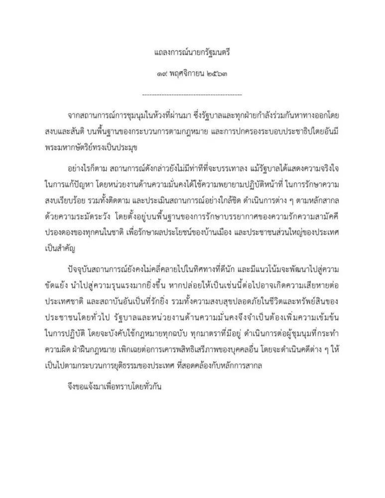 แถลงการณ์นายกรัฐมนตรี 19 พฤศจิกายน 2563