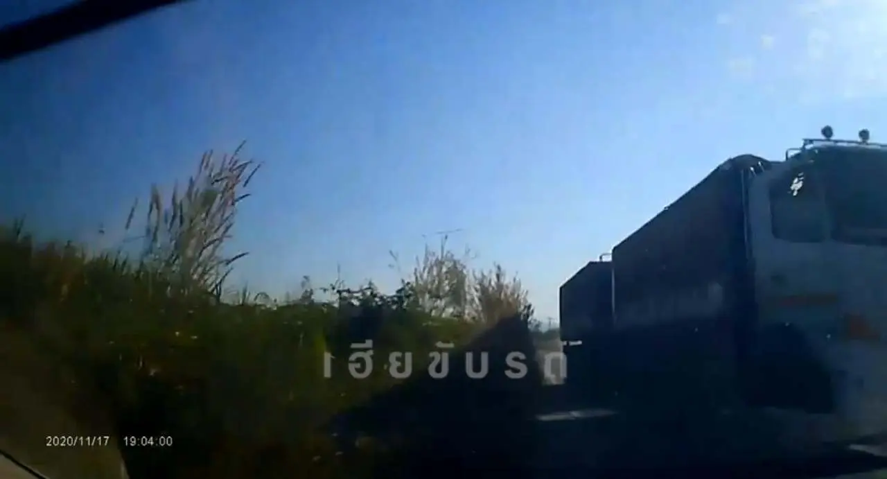 โดยเพจเฮียขับรถ ได้แชร์คลิปหน้ารถของรถยนต์คันหนึ่งที่ระหว่างขับไปตามทางเรื่อยๆนั้น ก็เจอเข้ากับรถบรรทุกที่กำลังจะแซงรถบรรทุกอีกคันจนกลายเป็นขับคู่กันเต็มถนน จนเจ้าของคลิปต้องเบี่ยงออกข้างทาง โชคดีที่ข้างทางนั้นยังเป็นพื้นดินปกติอยู่