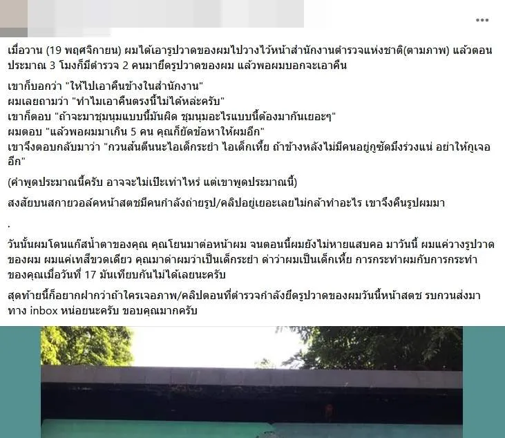 เมื่อวาน (19 พฤศจิกายน) ผมได้เอารูปวาดของผมไปวางไว้หน้าสำนักงานตำรวจแห่งชาติ(ตามภาพ) แล้วตอนประมาณ 3 โมงก็มีตำรวจ 2 คนมายึดรูปวาดของผม แล้วพอผมบอกจะเอาคืน