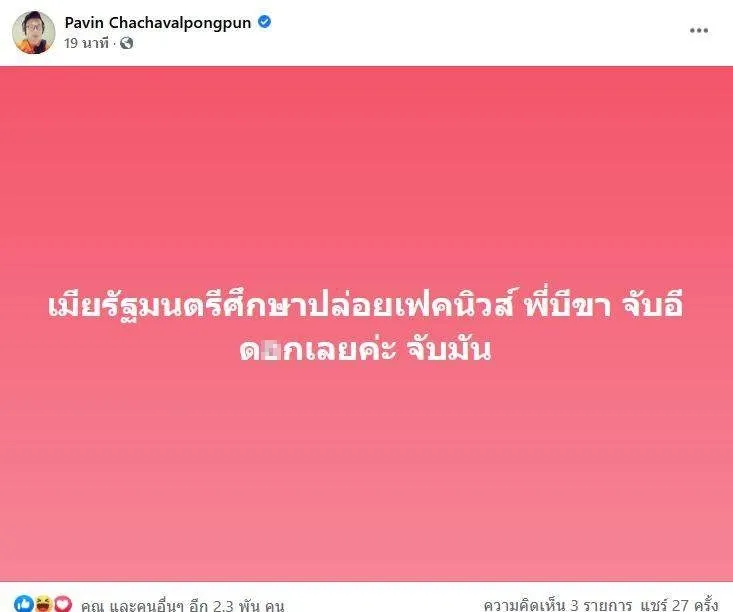 "อ.ปวิน" เดือด! ชี้ ให้จับ "เมียรัฐมนตรีศึกษา" หลังปล่อยเฟคนิวส์