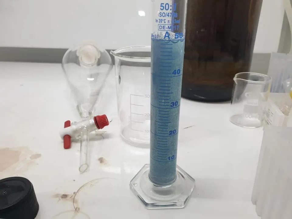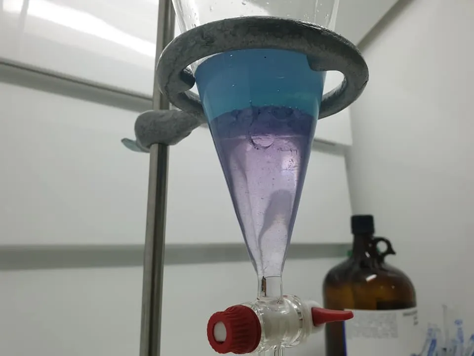 น้ำที่เก็บมามีสีฟ้าออกน้ำเงินนะครับเนื่องจากว่า ปนเปื้อนกับสีที่ผู้ชุมนุมใช้สีน้ำเงิน จึงปนกันกับน้ำสีม่วง แต่อาจารย์อ๊อดนำมาสกัดด้วย DCM จนได้สารละลายสีม่วงพร้อมกับสารที่อยู่ในนั้นออกมาแยกชั้นตามภาพที่ 1-3